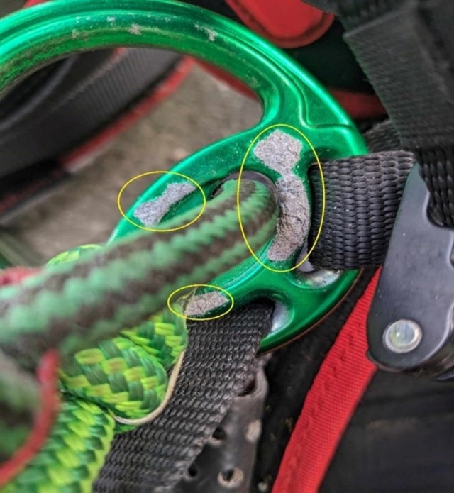 Proper maintenance, including frequent rinsing with clean drinking water and avoiding direct contact with other metals such as steel, is important and can reduce the likelihood of corrosion and rope and/or webbing abrasion.