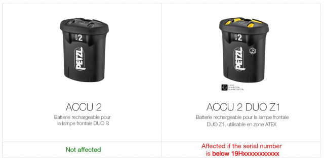 As a precautionary measure, Petzl is voluntarily recalling its ACCU 2 DUO Z1 rechargeable batteries with serial numbers below 19Hxxxxxxxxxxx.