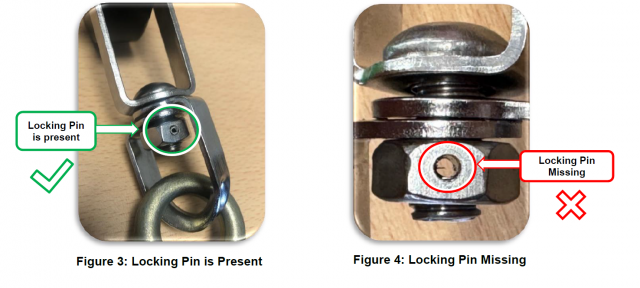 2) Inspect the product - Visually inspect the swivel connector of the unit for the presence of the silver locking pin.