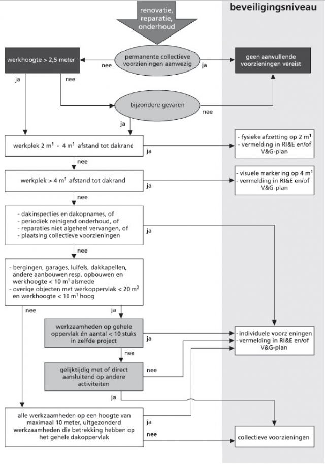 Wanneer er werkzaamheden plaatsvinden op 2,5 meter of hoger op bijvoorbeeld een dak moeten er voorzieningen ten behoeve van valbeveiliging worden getroffen. Ook wanneer men niet boven de 2,5 meter werkzaam is op bijvoorbeeld platte daken, maar waar wel risicofactoren aanwezig zijn, is het noodzakelijk om voorzieningen voor valbeveiliging te treffen (Arbobesluit 3.16).
