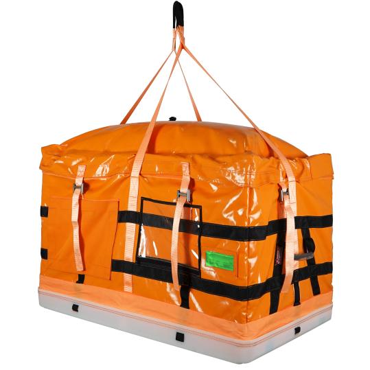 Zwaar 0,75 mm zeildoek, uitneembare kunststof platen, een robuuste PE-bodemplaat, veiligheidslinten, opblaasbaar deksel, RVS gespen, handgrepen aan beide einden en transparante documentatiemap.