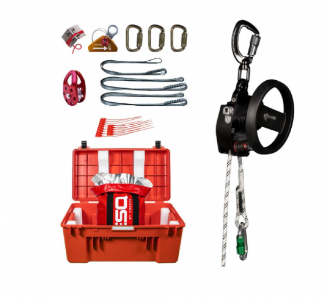 - 3x Connector, 3x Bandsling, 1x Katrol, 1x Touwklem, 1x Randbeschermer, 1x Reddings- en evacuatieapparaat incl. 200 meter touw, 1x Transportkist incl. vacuumverpakking
