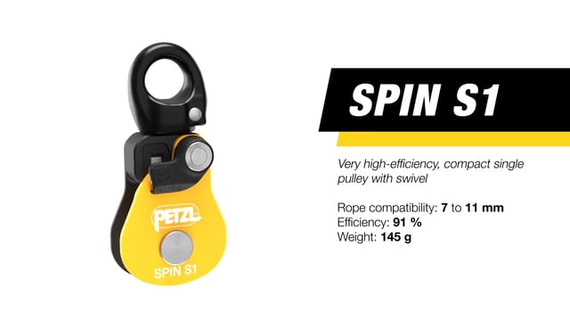 De Petzl Spin S1 is een compacte pulley met een geïntegreerde swivel en mobiele flank. De flank kan geopend worden, zelfs wanneer deze verankerd is. Ondanks zijn kleine formaat weet de Spin S1 een redement van 91% te behalen. Ideaal om te gebruiken in een compact katrolsysteem.