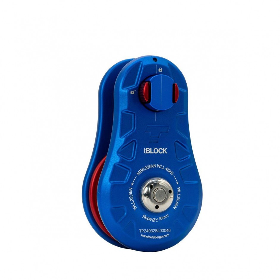 De Teufelberger Tblock is een compacte, robuuste rigging pulley, ontworpen voor het gecontroleerd laten zakken van lasten bij boomverzorging en riggingtoepassingen. Deze katrol is specifiek ontwikkeld voor professionals in de arboristiek en is niet geschikt voor gebruik als persoonlijk beschermingsmiddel (PPE). De Tblock kenmerkt zich door een uniek matrixontwerp, lichte constructie en een eenvoudig te bedienen sluitmechanisme op basis van een schroefbout. De hoogwaardige aluminium zijplaten zijn heetgesmeed en in combinatie met een roestvaststalen kern zorgt dit voor optimale duurzaamheid en een lange levensduur. Het product voldoet aan de Machinery Directive 2006/42/EC en ondersteunt lasten met een werkbelasting tot 45 kN.